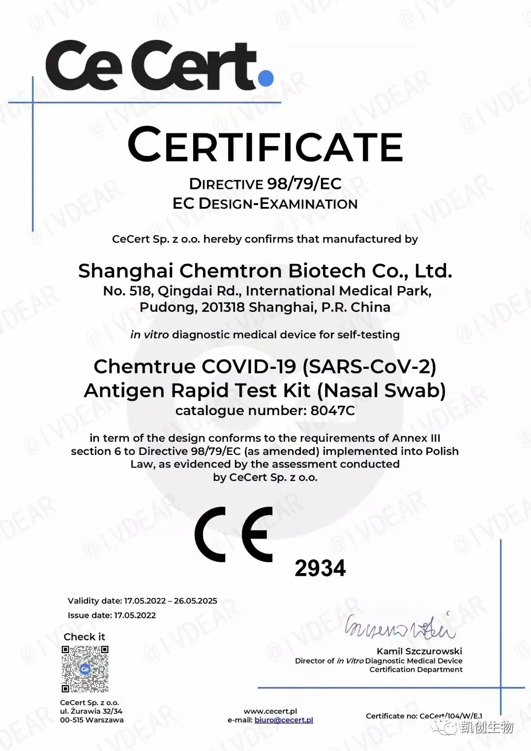 上海凱創(chuàng)生物技術有限公司研發(fā)的新型冠狀病毒(SARS-CoV-2)快速抗原檢測試劑盒(免疫層析法)自測產品獲得歐盟CE準入資格!這意味著該自測試劑盒可在歐盟國家以及認可歐盟CE認證的國家進行銷售。